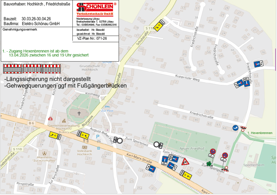 Vom 30. März bis 30. April 2026 kommt es im Bereich der Hausnummern 1 bis 4 der Friedrichstraße in Hochkirch zu einer Vollsperrung.