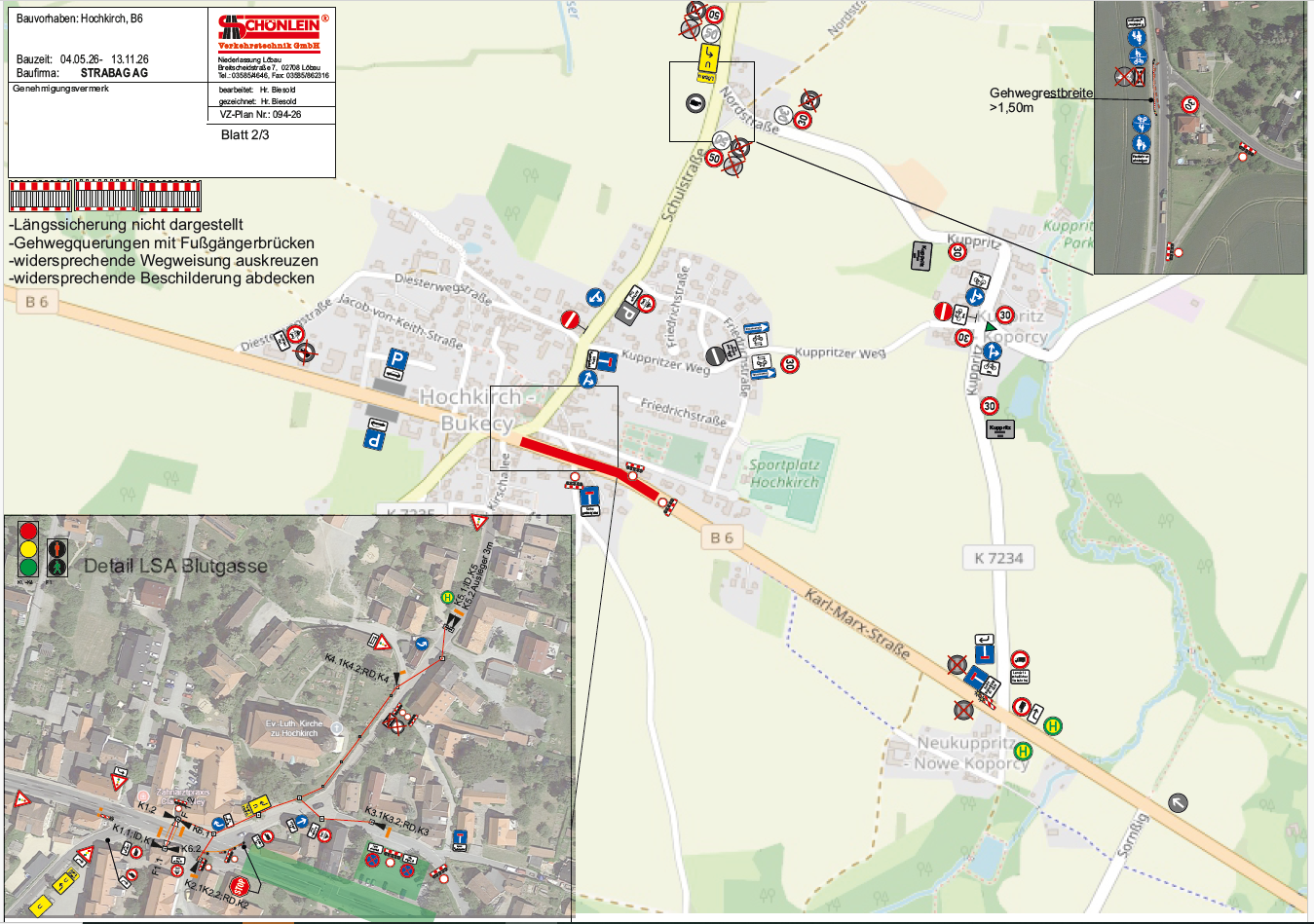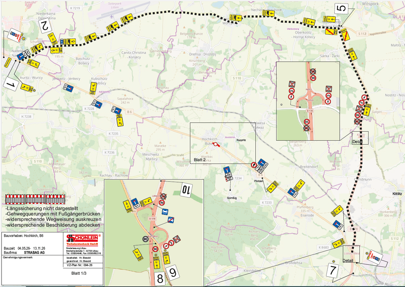 Der Ort Hochkirch soll vom reinen Durchgangsverkehr weiträumig umfahren werden. Anwohner und Anlieger nutzen bitte die eingerichteten Umleitungsstrecken. Eine Fußgängerampel für die Querung der B6 befindet sich auf Höhe des Konzert- und Ballhaus.