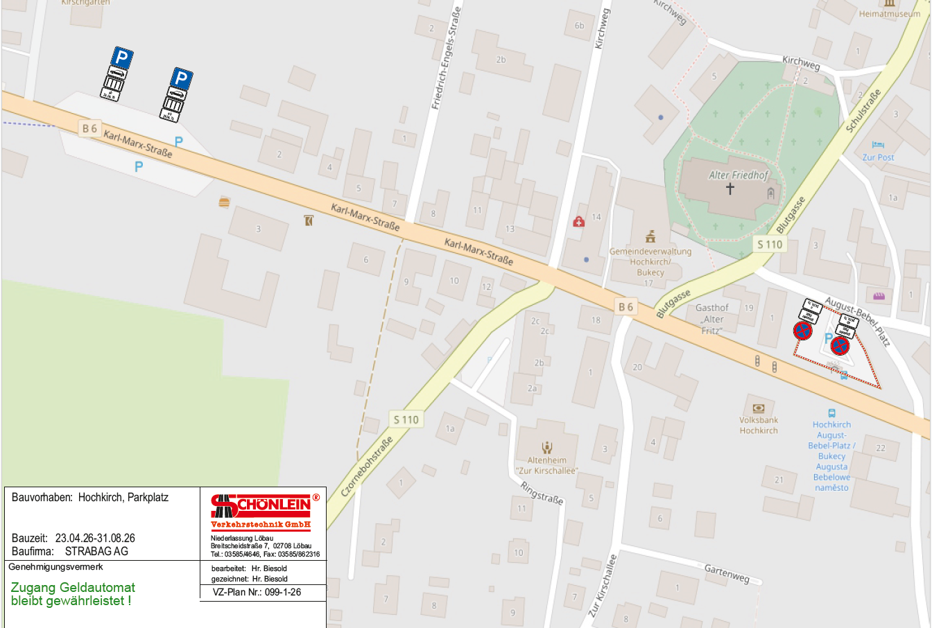 Aufgrund von Baumaßnahmen am August-Bebel-Platz in Hochkirch ist dieser in der Zeit vom 14. April bis voraussichtlich Oktober 2026 vollständig für den Verkehr gesperrt. Die Zufahrt zur Bäckerei und die Straße bleiben offen. Der Zugang zum Geldautomaten bleibt gewährleistet.